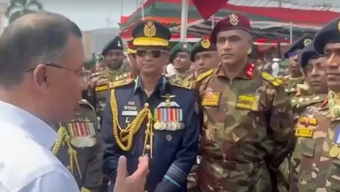 অনুষ্ঠান শেষে প্যারেড স্কয়ার ত্যাগের সময় উপস্থিত সশস্ত্র বাহিনী সদস্যদের সঙ্গে শুভেচ্ছা বিনিময় করেন প্রধানমন্ত্রী।