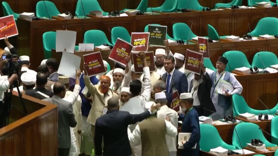 এর আগে, রাষ্ট্রপতি মো. সাহাবুদ্দিনকে ভাষণ দেওয়ার জন্য অনুরোধ জানান স্পিকার হাফিজ উদ্দিন। এ সময় বিরোধী দল জামায়াতের সংসদ সদস্যরা দাঁড়িয়ে প্রতিবাদ জানান। তাদের হাতে প্ল্যাকার্ড দেখা যায়। প্ল্যাকার্ডে ‘জুলাই নিয়ে গাদ্দারি চলবে না’, ‘জুলাইয়ের সঙ্গে বিশ্বাসঘাতকতা বন্ধ কর’সহ বিভিন্ন স্লোগান লেখা রয়েছে। স্পিকার এ সময় সবাইকে শান্ত থাকতে আহ্বান জানান।